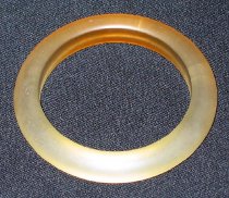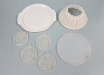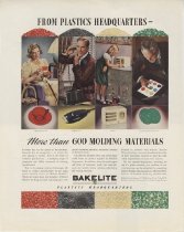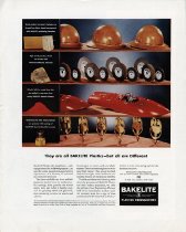 Color printed ad for Bakelite. Ad features four rows of images. From top to bottom: 3 workmen's helmets; high-speed grinding wheels; 2 red model boats; and 6 door-knockers.
