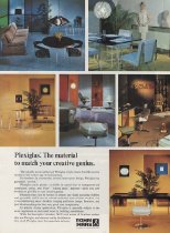 Color printed Plexiglas ad from Rohm & Haas. Ad features six images showing Plexiglas tables and chairs in different rooms. A tiny pencil mark is located at the bottom of the page.