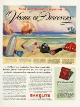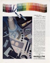 Color printed ad for Bakelite. Color spectrum located at top of page.Image on left side depicts a combination of objects made with Bakelite including: belts, jewelery, a car, and a plane model.