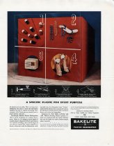 Color-printed magazine ad for Bakelite. Image depicts a red box displaying different items made of bakelite. Under the image, a text box describes each item.