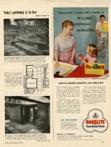 Color printed ad for Bakelite. Image on top depicts a family is in a kitchen. The little girl is talking to the woman while holding a tomato. A man is behind them. Pencil mark "Better Homes & Gardens, July 1955, pg. 105" at left side of bottom on page 106.