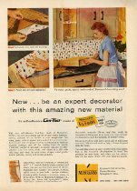 Color printed ad for Monsanto Chemical Co., two smaller square images and one larger square image are on the top of the page. Images show a red hair woman who is using the product in a kitchen. The other side, "Good Housekeeping, Nov. 1954, pg. 165" is written in pencil at the bottom